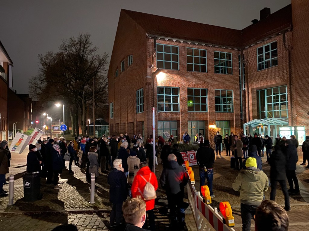 „Kaltenkirchen war ein weiteres Mal Treffpunkt von Menschen, die sich gegen Corona-Einschränkungen und eine Impfpflicht stellen, die sich in ihren Freiheiten beschnitten fühlen. 400 „Spaziergänger“, so viele wie noch nie, darunter auch Familien mit Kindern sowie Politiker der AfD, viele mit Lichterketten, zählte die Polizei bei dieser unangemeldeten Versammlung. Wie viele angesichts einer überregionalen Mobilisierung tatsächlich aus Kaltenkirchen waren, lässt sich nur spekulieren. Aber, und das war eine Premiere, ihnen stellten sich 100 Personen entgegen, die das neue „Bündnis für Demokratie und Zivilcourage“ binnen weniger Tage zusammengebracht hatte. Und das als angemeldete Kundgebung direkt vor dem Rathaus, sodass die Maßnahmengegner eine andere Route nehmen mussten. Die Polizei sperrte den Bereich ab Brauerstraße/Holstenstraße, beide Seiten kamen sich also nicht in die Quere. Die Form der Außendarstellung könnte kaum unterschiedlicher sein. Der Marsch durch die Straßen in der Stadtmitte verlief ohne Plakate und Wortbeiträge, die Menschen hielten laut Polizei zwar weitestgehend den geforderten Abstand zueinander ein, Masken wurden dafür keine getragen. Pandemiegerecht hingegen der Gegenprotest: mit FFP2 und sogar ausgehängten QR-Codes für die Corona-Warn-App. Eine Sprecherin des Bündnisses erklärte bei einer Rede, warum man sich entschieden habe, aktiv zu werden. „Die Spaziergänger treffen sich nicht zufällig. Es wird Frieden, Freiheit, keine Diktatur gebrüllt, aber man geht Hand in Hand mit Rechten. Genau denen, die für das Gegenteil stehen.“ Die Demos seien als Spaziergänge getarnt, um Auflagen wie die Maskenpflicht zu umgehen. „Jeder hier ist von der Krise in der einen oder anderen Weise betroffen, und ich habe wirklich Verständnis für die Menschen, die besorgt und von Maßnahmen hart getroffen sind.“ Die Versammlung solle ein Zeichen für Solidarität sein. „Wir sitzen in einem Boot. Gemeinsam und mit Rücksichtnahme bewältigen wir diese Krise. Und wir möchten ein Zeichen gegen Verschwörungsmythen, Fake News und rechtes Gedankengut setzen. Wir lassen uns nicht spalten, stellen uns aber gegen die rechten Anheizer und Meinungsmacher. Die Mehrheit der Bevölkerung hat klar bewiesen, dass sie die wichtigen Maßnahmen mitträgt.“ Sie kündigte an, dass es nicht bei dieser einen Veranstaltung bleiben werde.“