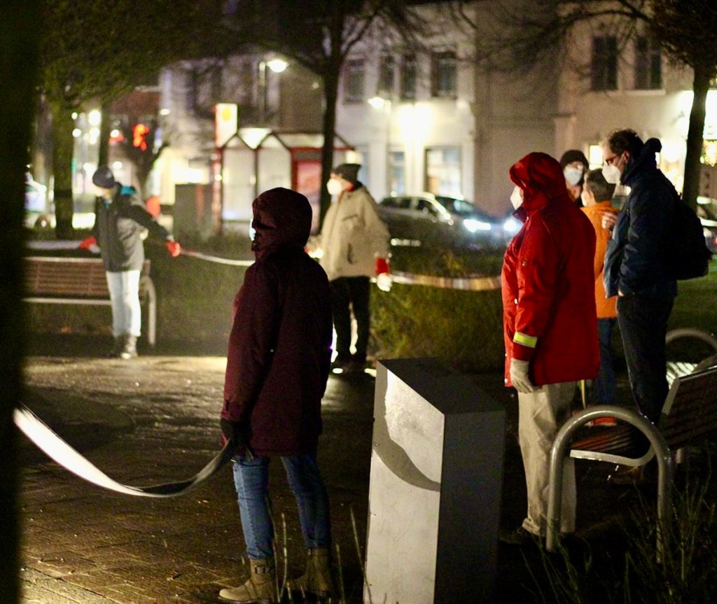 „Der Protest gegen die Corona-Maßnahmen in Kaltenkirchen hält an. Am Mittwochabend gab es in der Innenstadt wieder einen Demonstrationszug von rund 350 Maßnahmen-Gegnern. Aber auch das Kaltenkirchener Bündnis für Demokratie und Zivilcourage zeigte Flagge. Gut 80 Teilnehmer bildeten vom Rathaus bis zum Brunnen auf dem Grünen Markt eine Menschenkette für Zusammenhalt und Menschlichkeit in der Pandemie und als Gedenken an die vielen Opfer. Dafür steht auch die evangelische Kirchengemeinde und ließ als Zeichen die Glocken der Michaeliskirche läuten. Die Sprecherin des Bündnisses, die aus Angst für Repressalien nicht mit Namen erscheinen möchte, war stolz, dass trotz des miesen Wetters mit Dauerregen doch so viele Menschen ihrem Aufruf gefolgt waren. Auf offizielle Reden wurde bewusst verzichtet, denn „wir wollen heute auch ein stilles Zeichen“ setzen gegen Verschwörungstheorien, eine Radikalisierung der Gesellschaft und die Verbindungen der „Spaziergänger“ zur rechtsradikalen Szene.“